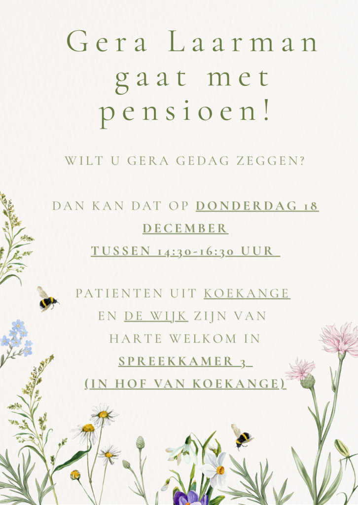 Welkom op de website van apotheekhoudende huisartsenpraktijk de Wijk. Hier vindt u meer informatie over het het maken van afspraken, medicatie bestellen, uw gezondheid en nog veel meer.